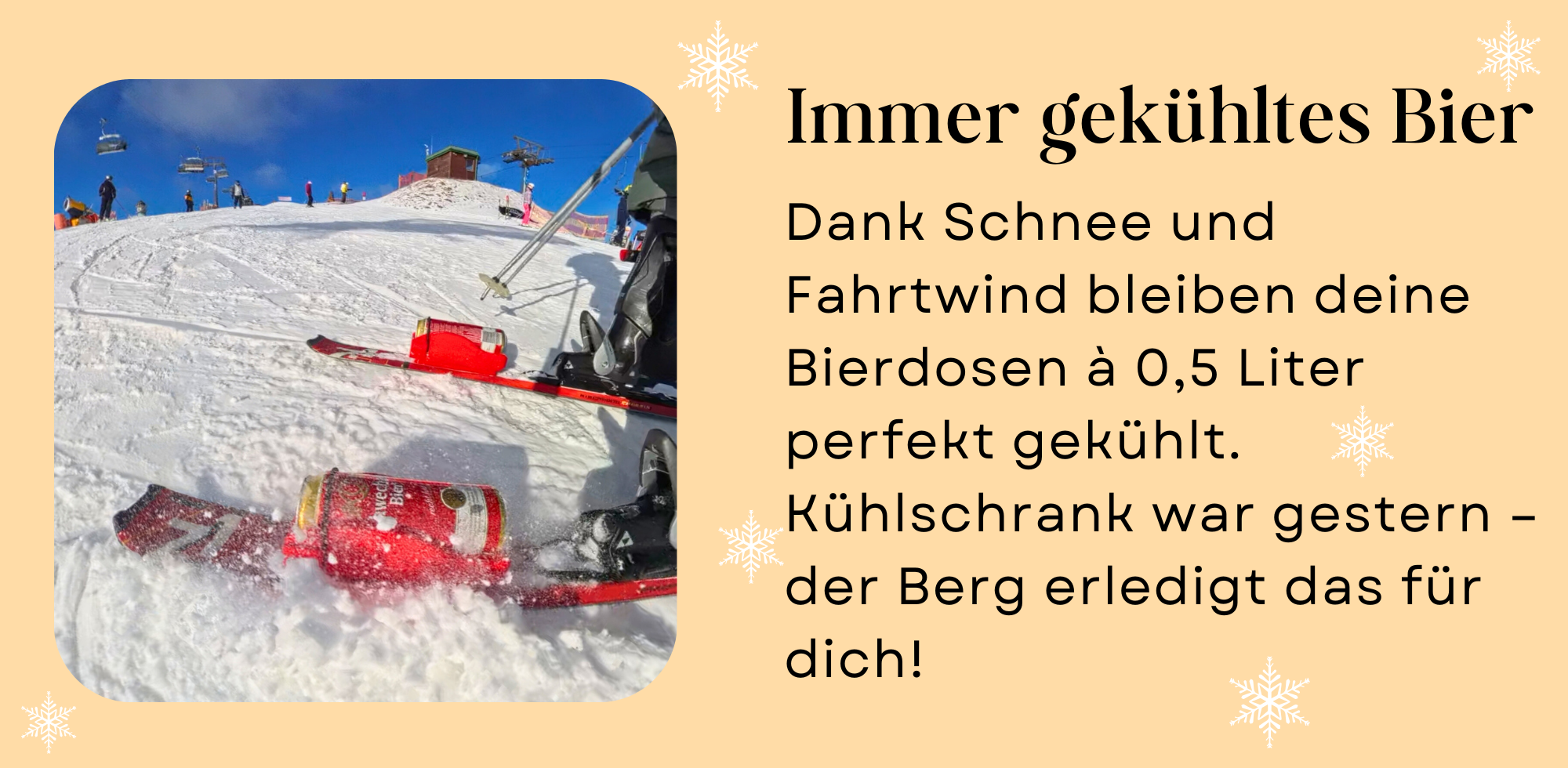 Der Bierflitzer bietet Platz für eine 0,5-Liter-Getränkedose und hält dein Pisten-Bier sicher, fest und kühl – ideal für jede Pistengaudi mit deinen Freunden.
