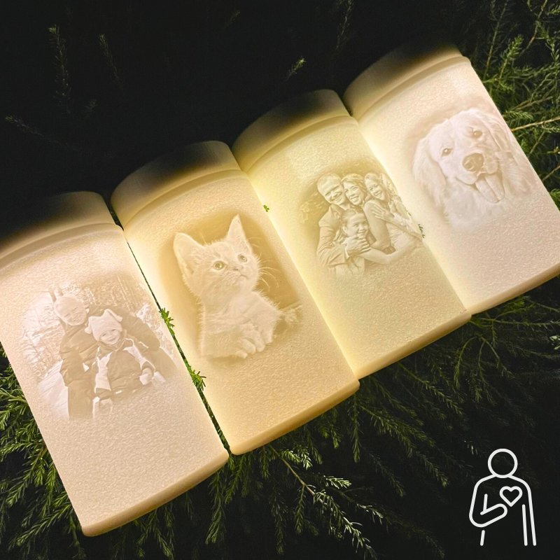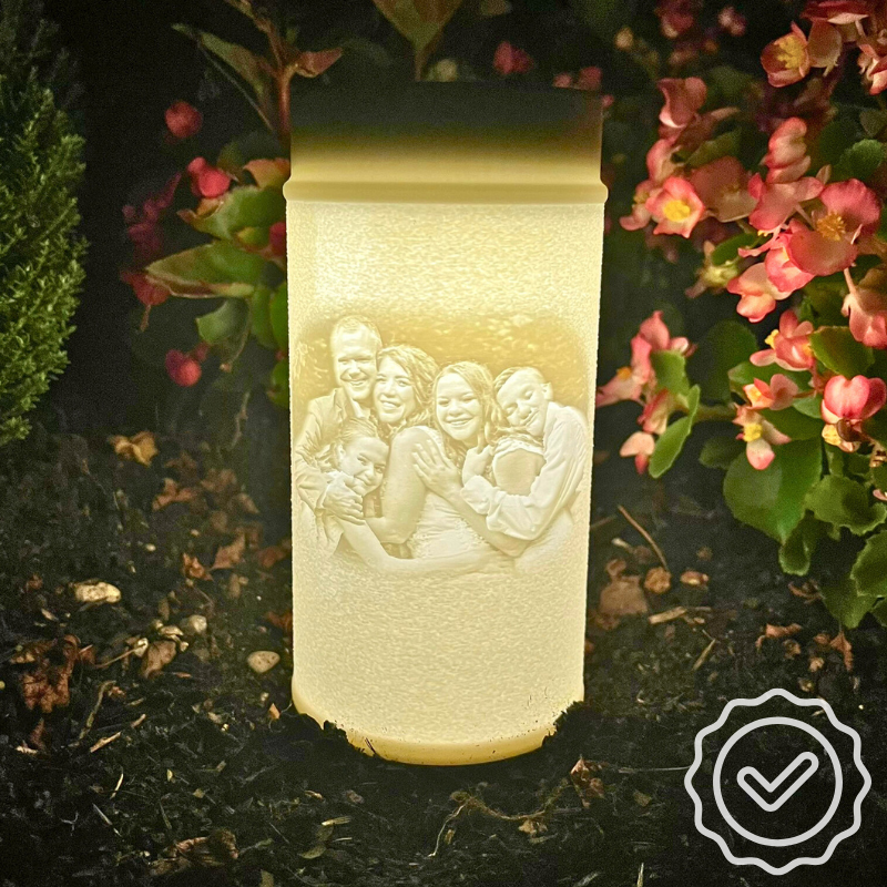Unser Lithografie-Grablicht ist eine individuell gestaltbare Gedenkbeleuchtung, die mithilfe von 3D-Drucktechnologie gefertigt wird. Das Besondere: Auf dem Leuchtelement wird dein eingesendetes Bild als feines Relief abgebildet. Bei eingeschalteter Beleuchtung wird das Bild von innen sanft erleuchtet – für eine würdevolle Erinnerung in stimmungsvollem Licht.