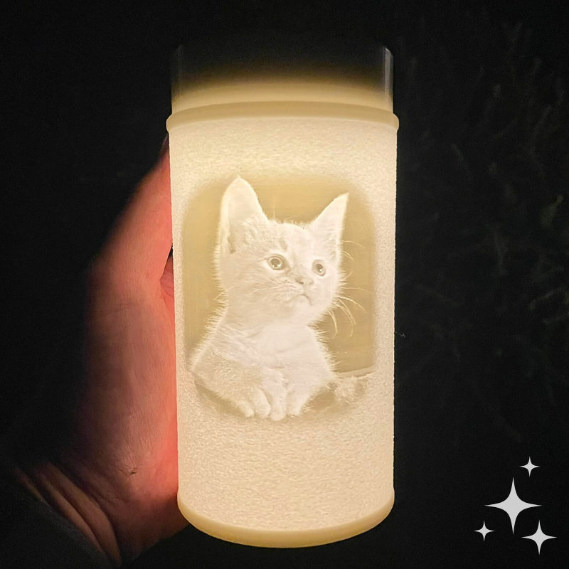 Du kannst uns ganz einfach ein persönliches Bild übermitteln. Das kann z. B. ein Porträt, ein gemeinsames Erinnerungsfoto oder auch ein Symbol sein, das dir am Herzen liegt. Wir fertigen daraus ein individuelles Lithophane-Relief. Auf Wunsch kann auch ein Name oder ein Datum ergänzt werden.