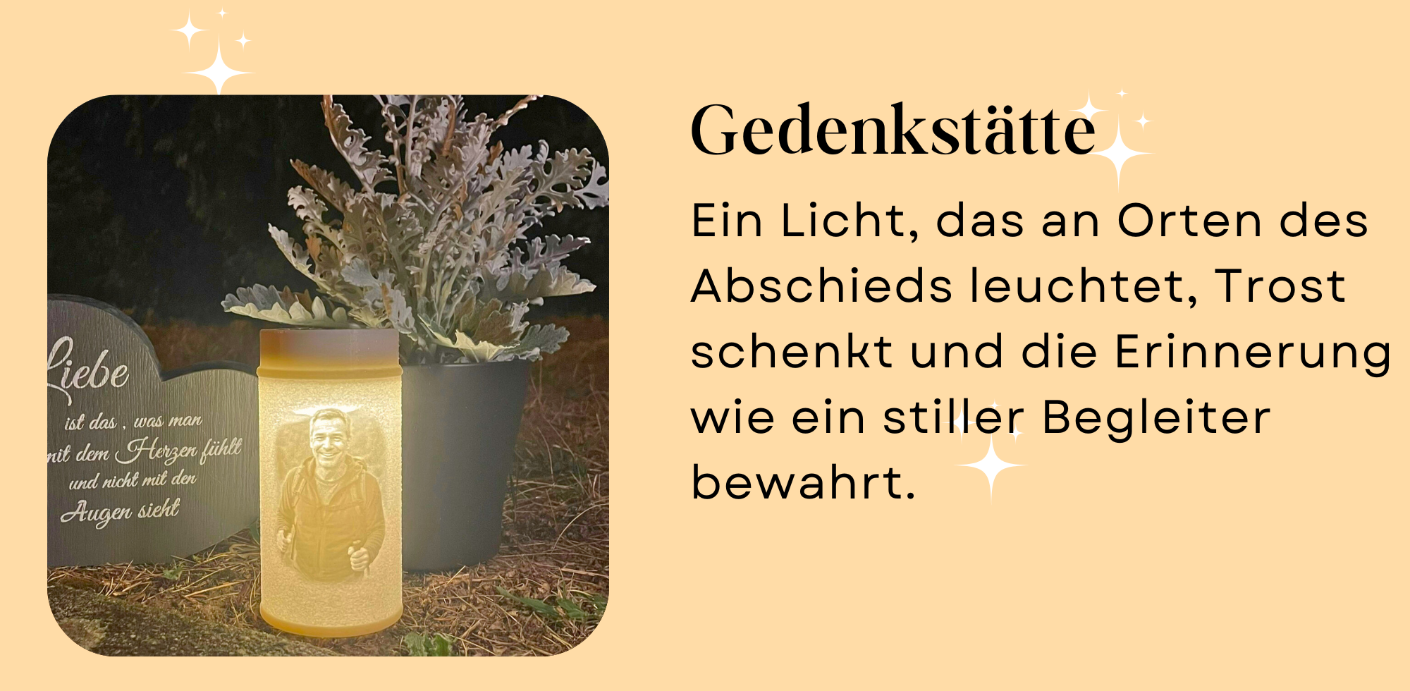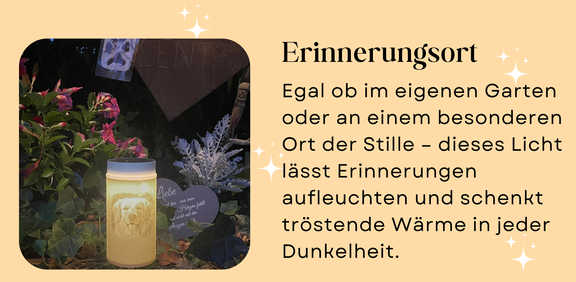 Ein Licht, das euch niemals allein lässt – ein stiller Wächter, der Tag und Nacht Wärme schenkt und die Erinnerung an eure Liebsten liebevoll behütet.
