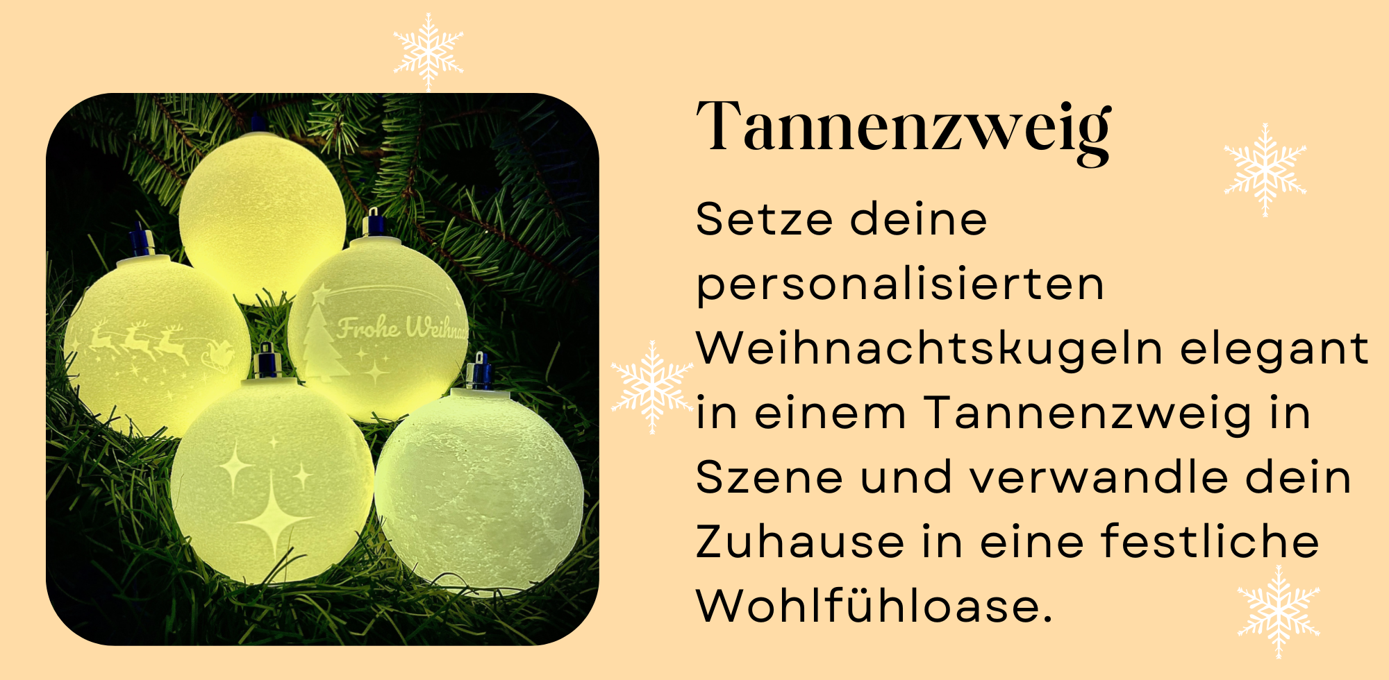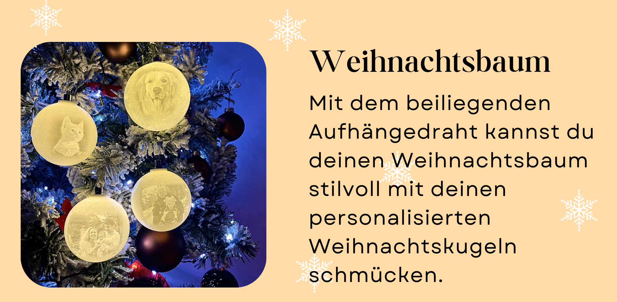 Du kannst uns ganz einfach dein persönliches Bild zusenden. Das können Fotos von Haustieren, Familienbildern, Pärchenfotos oder auch ein Firmenlogo sein. Wir drucken dieses Bild auf die Kugel. Zusätzlich hast du die Möglichkeit, zwischen verschiedenen weihnachtlichen Hintergründen auszuwählen, um dein Bild perfekt in Szene zu setzen.